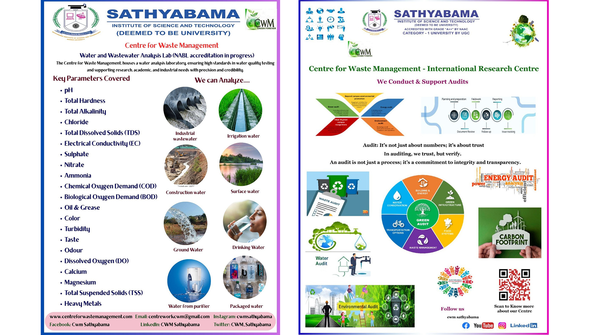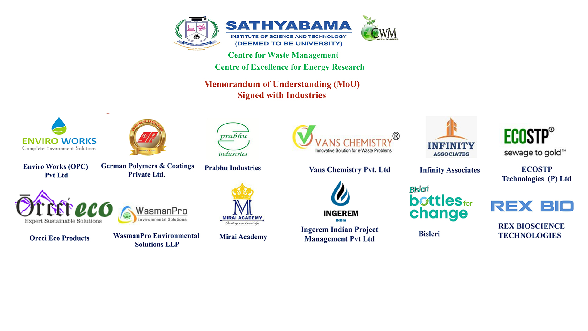 Sathyabama Institute of Science and Technology (Deemed to be University) is a pioneer in engineering education established with the aim of providing quality higher education in the areas of engineering, science and technology on par with international standards. It persistently seeks and adopts innovative methods to improve the quality of higher education on a consistent basis. The campus has a cosmopolitan atmosphere with students from all corners of the globe. Experienced and learned teachers are strongly encouraged to nurture the students. Having acquired excellence in the academic part of education with all sophisticated facilities available; the University has established its footprints in the field of Research. To encourage and motivate researchers across the globe, several research centres have been initiated in the university and are progressively working towards innovation in the field of Science and technology. Environmental pollution and Aesthetic degradation is increasing in such a drastic pace which has lead to serious focus on managing the waste generated. As a part of expanding its research wing Sathyabama Institute of Science and Technology (Deemed to be University) with the joint initiative of the National Solid Waste Association of India (NSWAI) has established the Centre for Waste Management. The Centre since its inception in 2011 has been involved in research leading to innovative products, developing patent liable novel ideas in Waste Management, publishing the experimental outcomes in indexed/peer reviewed journals, training graduate students, offering consultancy services and involves in several outreach activities in transferring the research findings for societal benefit.