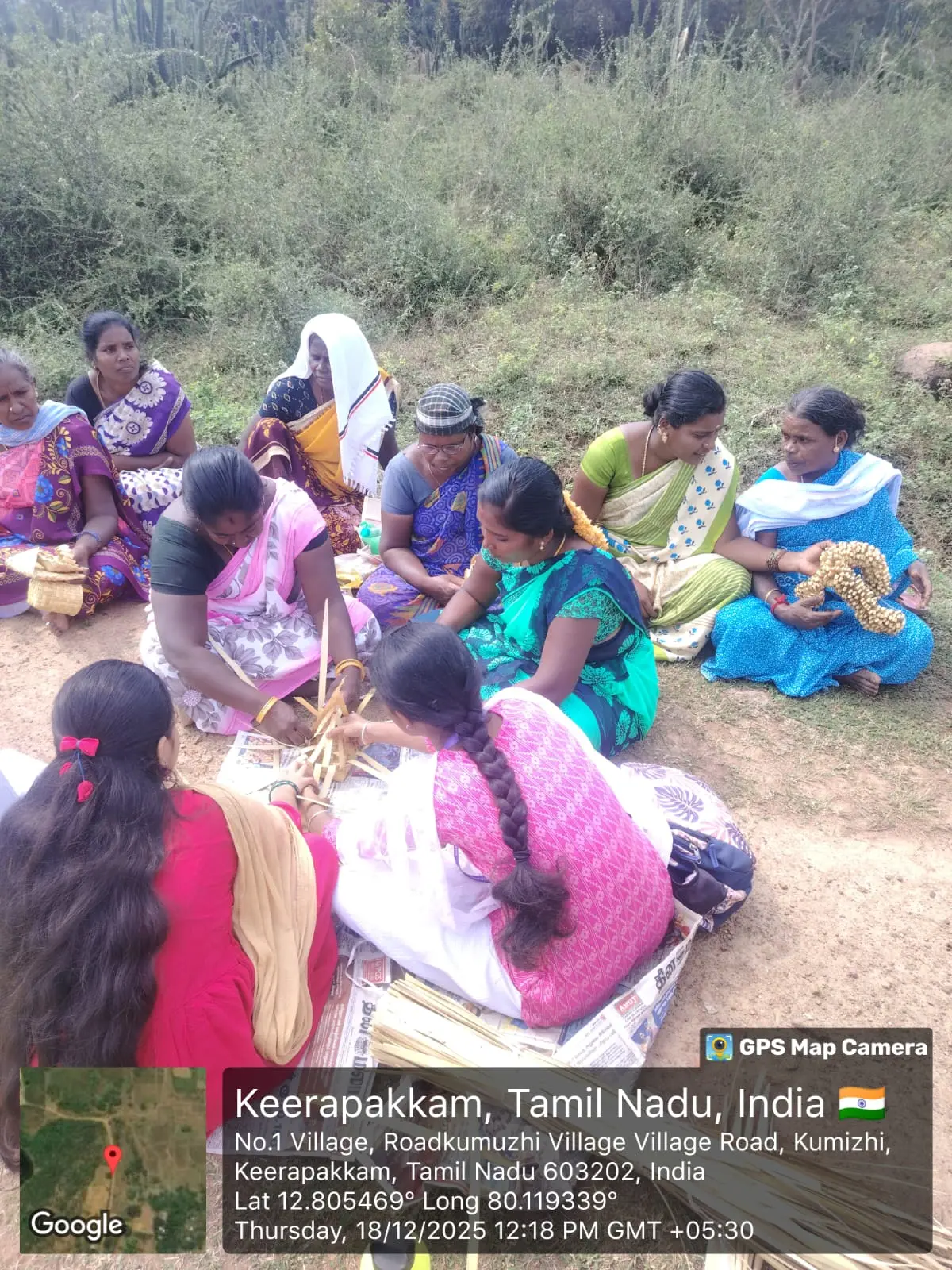 A training programme titled “Empowering Rural Women through Sustainable Palm Leaf Craft Entrepreneurship” was organized on 18 December 2025 at Kumizhi Village by the School of Bio and Chemical Engineering & Department of Chemical Engineering, Sathyabama Institute of Science and Technology, in association with the Centre for Waste Management and the Indian System of Medicine Laboratory. The programme was conducted as a Sathyabama–UBA initiative to commemorate International Volunteers Day for Economic and Social Development. The hands-on training focused on empowering rural women through sustainable palm leaf craft entrepreneurship, promoting a waste-to-wealth approach. Participants were trained to create value-added eco-friendly products from palm leaves, enhancing their vocational and entrepreneurial skills. The initiative contributed to rural livelihood development, women empowerment, and sustainable community growth, aligning with national development goals and sustainable development practices.