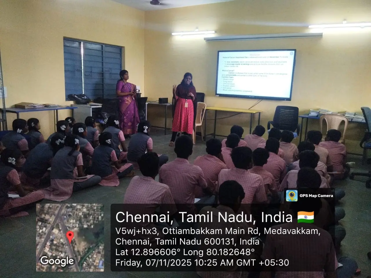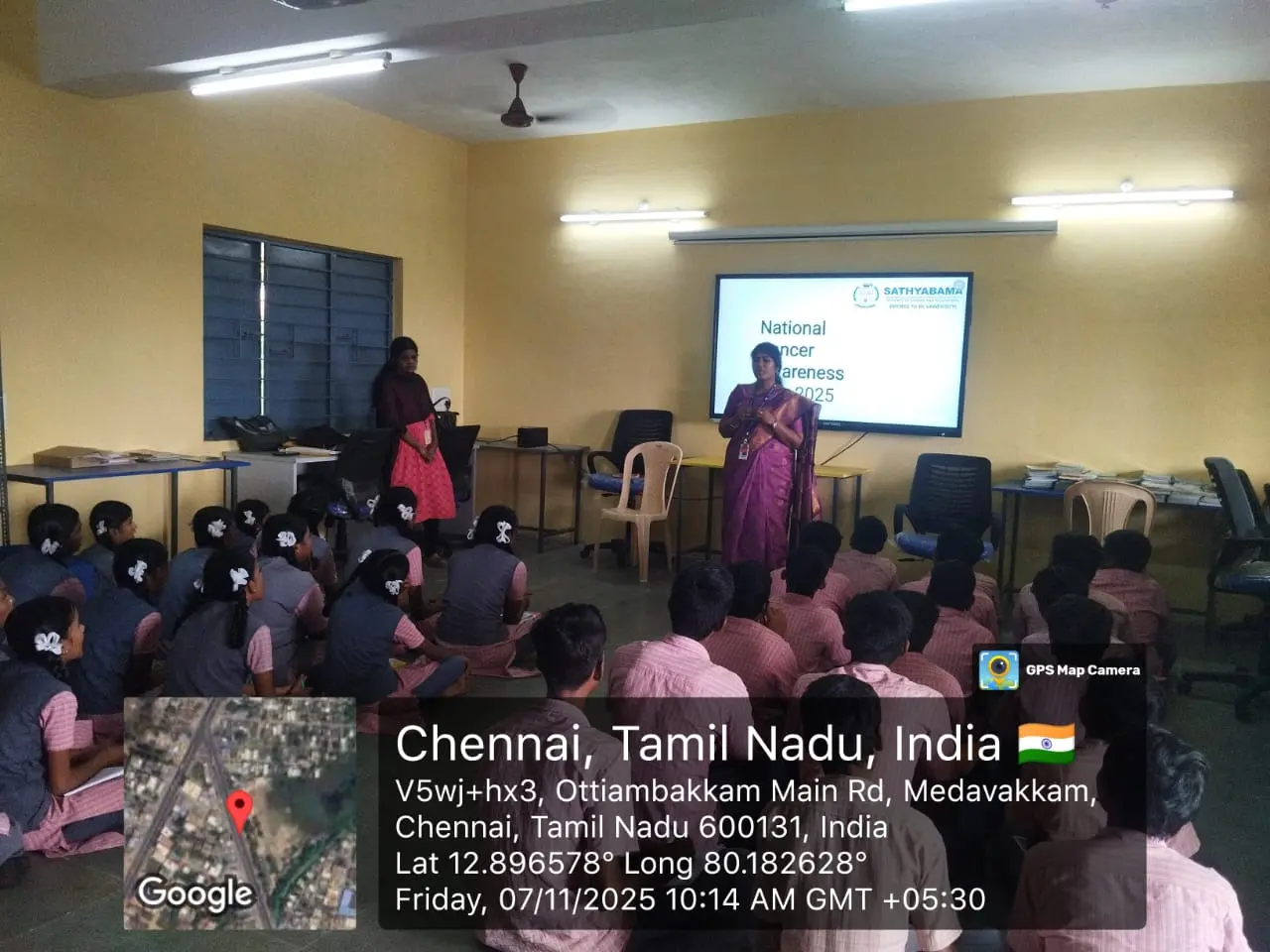 Centre for Waste Management, Centre of Excellence for Energy Research (Bioenergy Division) Sathyabama Institute of Science and Technology conducted an Awareness programme on EMPOWER TO PREVENT: RAISING CANCER AWARENESS on 07 NOVEMBER 2025 at GOVERNMENT HIGH SCHOOL, SITHALAPAKKAM. Students from Government High School, Sithalapakkam were introduced to the Cancer and the need for awareness about cancer. The students also given awareness about the food to be taken and avoided to prevent cancer and also the lifestyle changes. 40 students were enthusiastically participated in the programme and get awareness