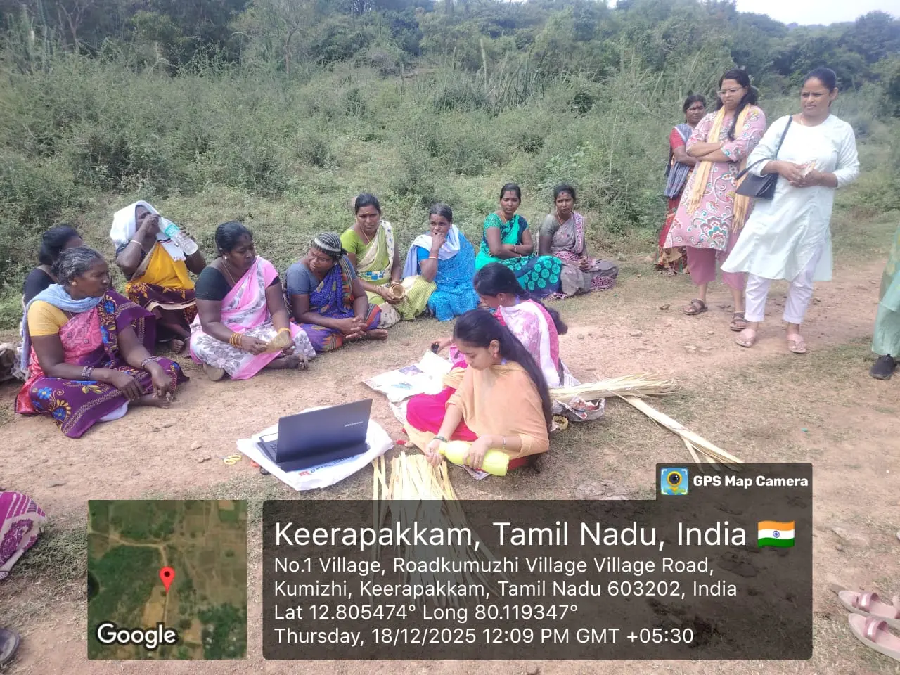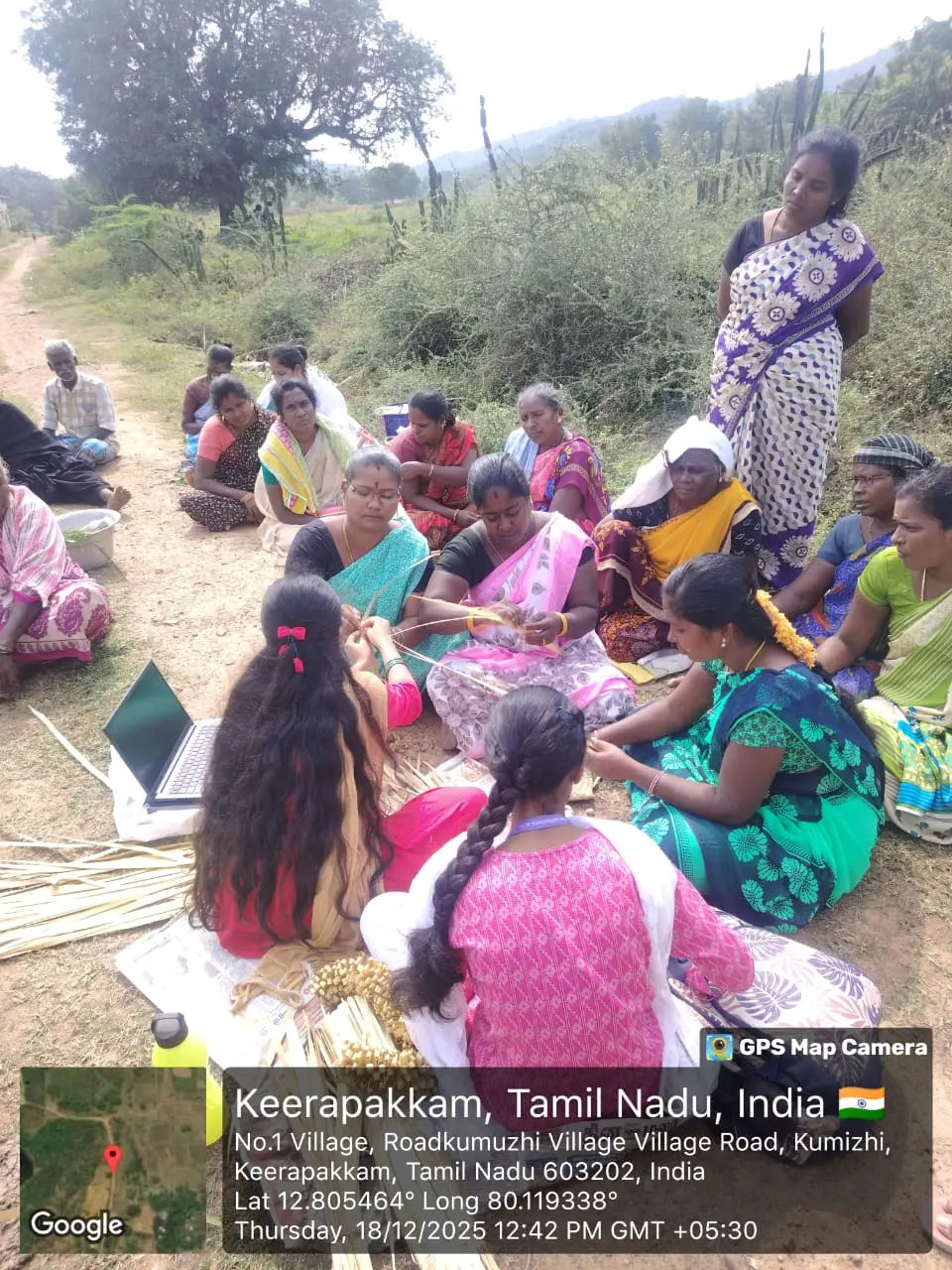 A training programme titled “Empowering Rural Women through Sustainable Palm Leaf Craft Entrepreneurship” was organized on 18 December 2025 at Kumizhi Village by the School of Bio and Chemical Engineering & Department of Chemical Engineering, Sathyabama Institute of Science and Technology, in association with the Centre for Waste Management and the Indian System of Medicine Laboratory. The programme was conducted as a Sathyabama–UBA initiative to commemorate International Volunteers Day for Economic and Social Development. The hands-on training focused on empowering rural women through sustainable palm leaf craft entrepreneurship, promoting a waste-to-wealth approach. Participants were trained to create value-added eco-friendly products from palm leaves, enhancing their vocational and entrepreneurial skills. The initiative contributed to rural livelihood development, women empowerment, and sustainable community growth, aligning with national development goals and sustainable development practices.